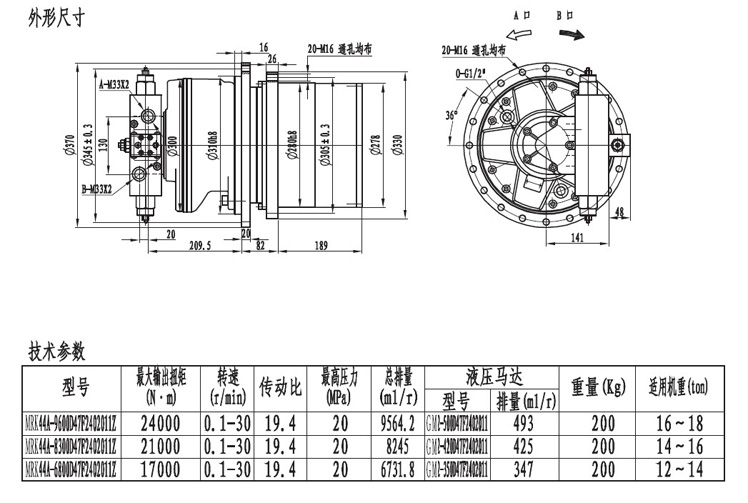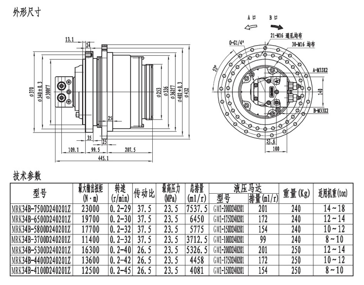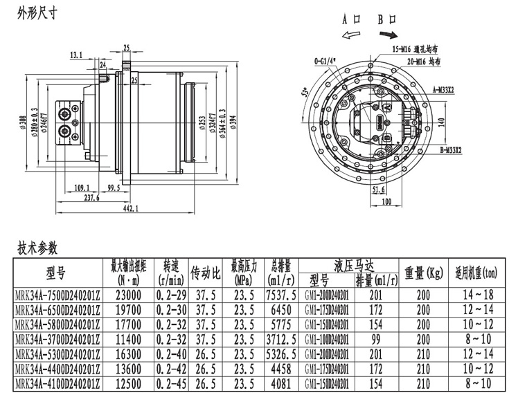 MRK34系列履帶(車輪)用的行走減速機輸出扭矩在20000NM左右,最低轉速能達到0.2轉每分,采用兩級速比行星齒輪箱傳動,外形緊湊,機械通過性極強。